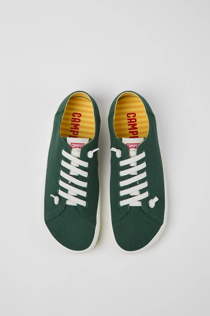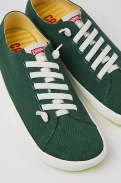 Green textile men’s sneakers with OrthoLite® Recycled™ removable footbeds and rubber outsoles.