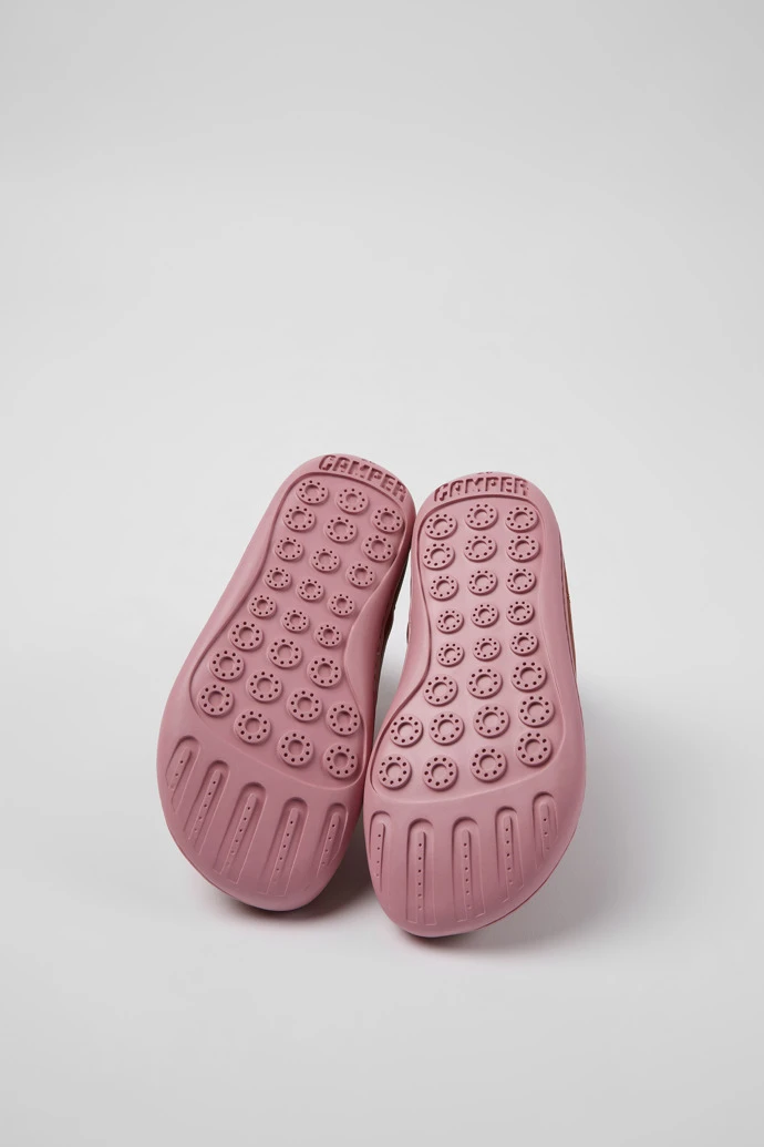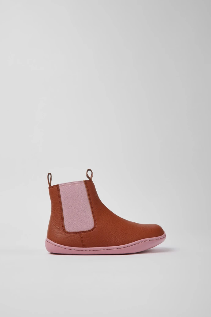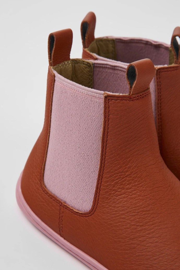 Red leather kids’ ankle boots with rubber outsoles (20% recycled).
