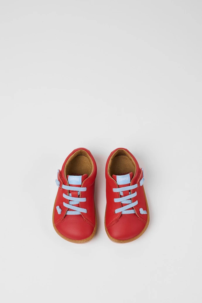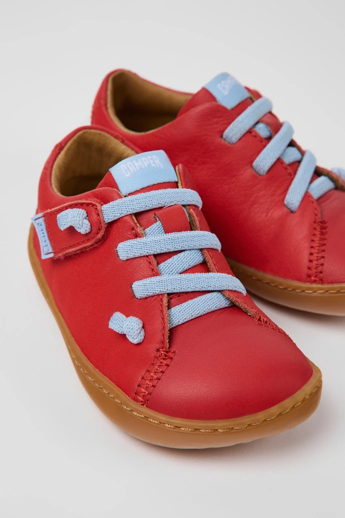 Red leather kids’ shoes with easy-fit elastic laces, EVA footbeds, and rubber outsoles.