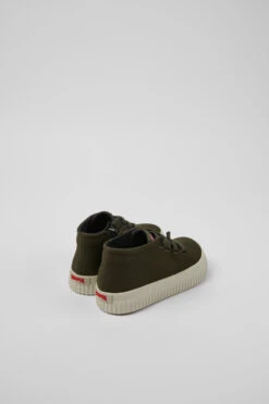 Green textile kids’ sneakers with recycled cotton uppers, OrthoLite® Recycledâ„¢ removable footbeds, and rubber outsoles.