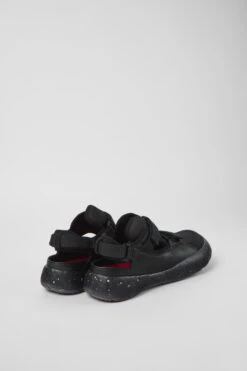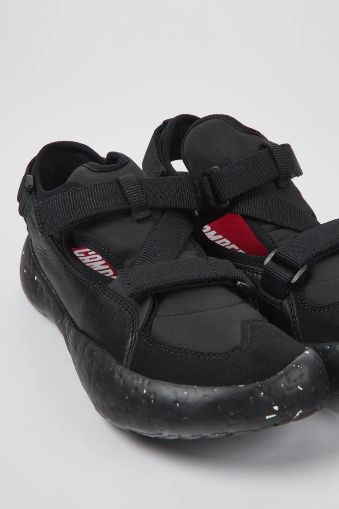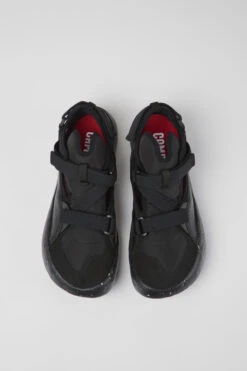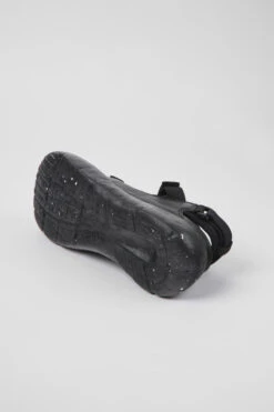 Black recycled PET webbing, organic cotton, and leather men’s semi-open sneakers with XL EXTRALIGHT® Sustainable+ outsoles (51% recycled EVA) and a hook-and-loop closing system.