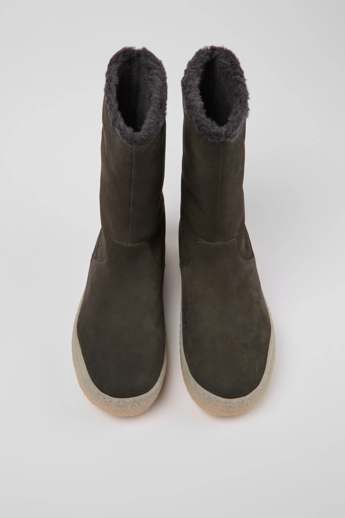 Gray nubuck women’s boots with OrthoLite® Recycled™ non-removable footbeds,and rubber outsoles.
