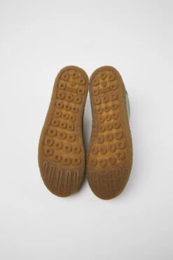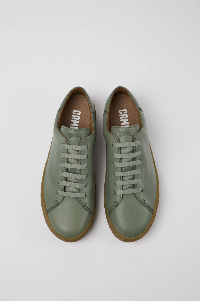 Green leather men’s shoes, OrthoLite® Recycled™ non-removable footbeds, and rubber outsoles.