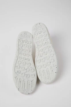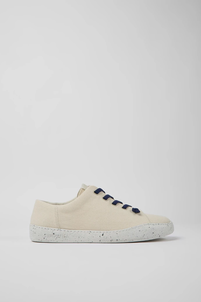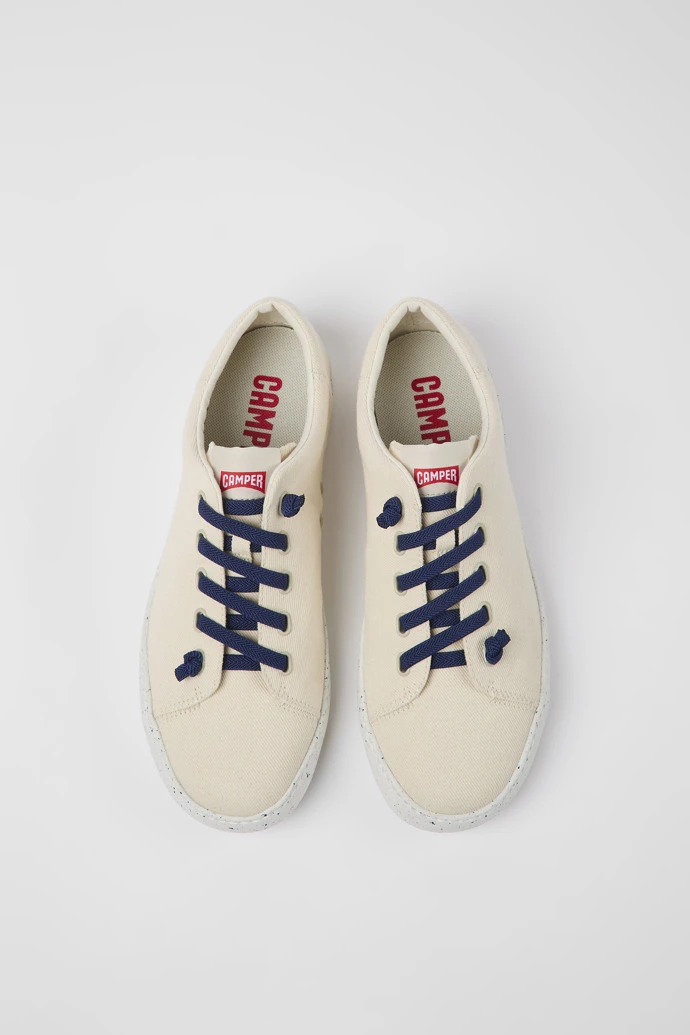 Beige textile men’s sneakers with OrthoLite® Recycled™ removable footbeds and EVA outsoles (20% recycled).
