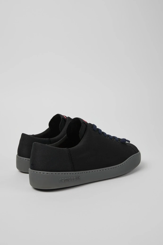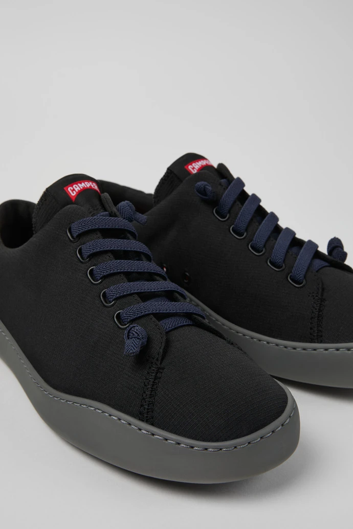 Black textile men’s sneakers with OrthoLite® Recycledâ„¢ removable footbeds and EVA outsoles (20% recycled).