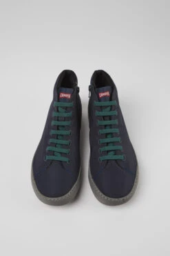 Blue textile ankle boots for men. 80% PET recycled upper with contrast EVA outsole, recycled OrthoLite® footbed and elastic laces.