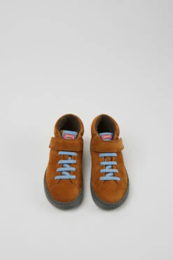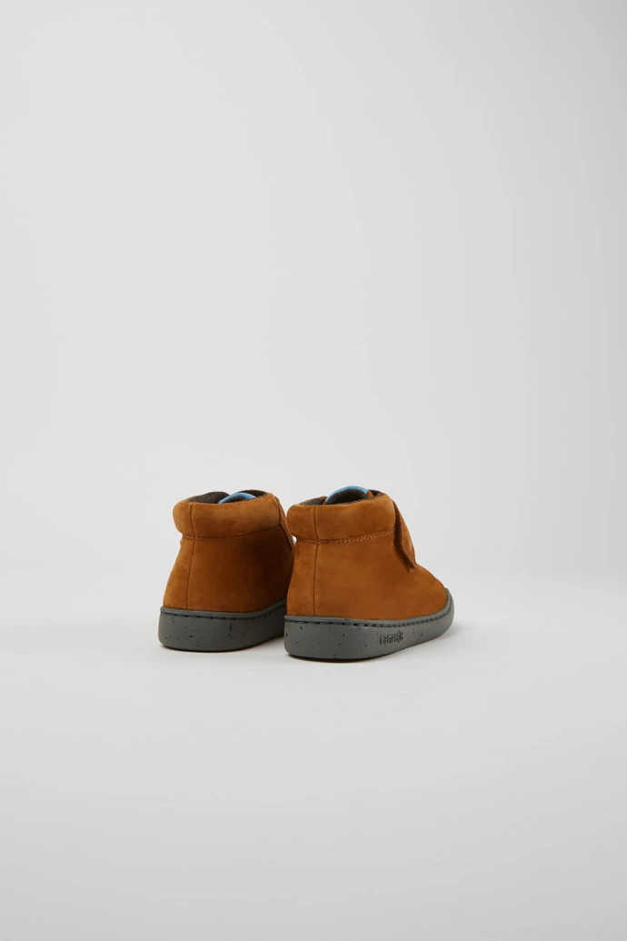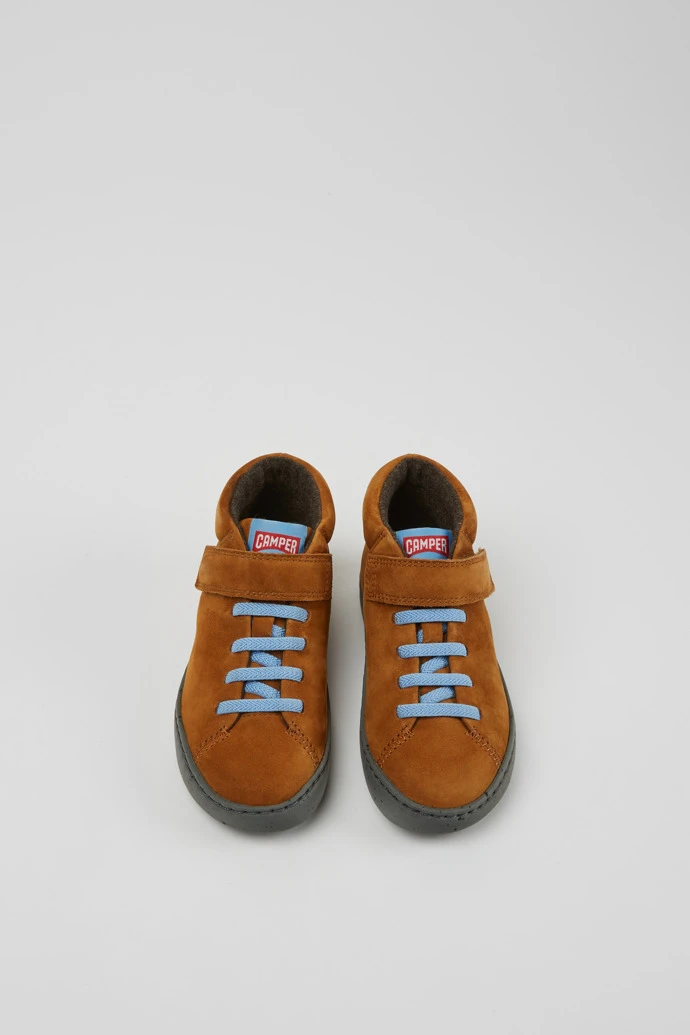 Brown nubuck boots for kids with Hook & Loop closing system, OrthoLiteĀ® removable footbed and 100% EVA outsoles (20% recycled)