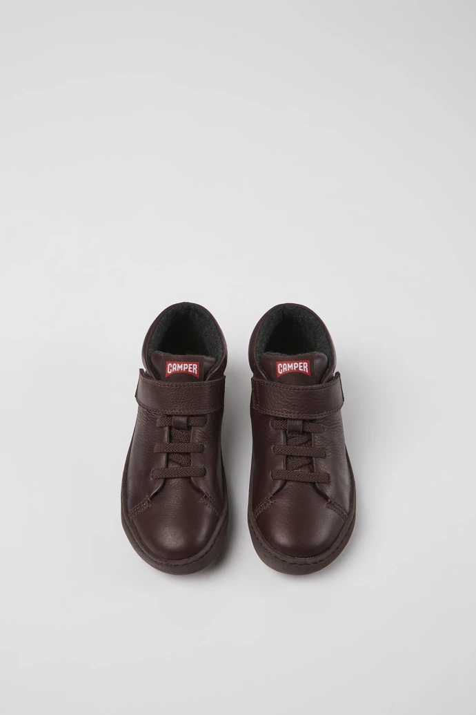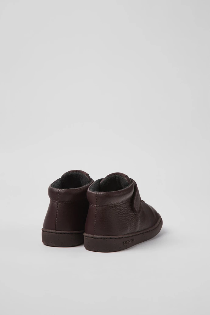 Burgundy leather kids’ ankle boots with hook-and-loop closing system and EVA outsoles (20% recycled).