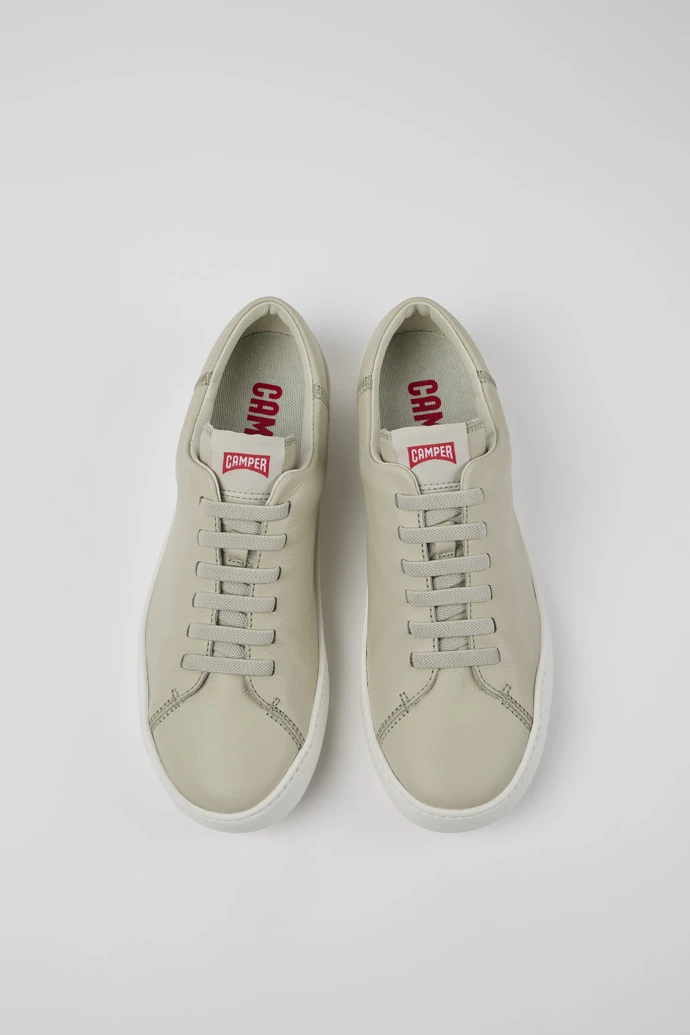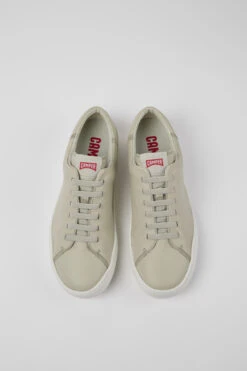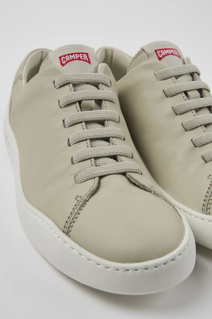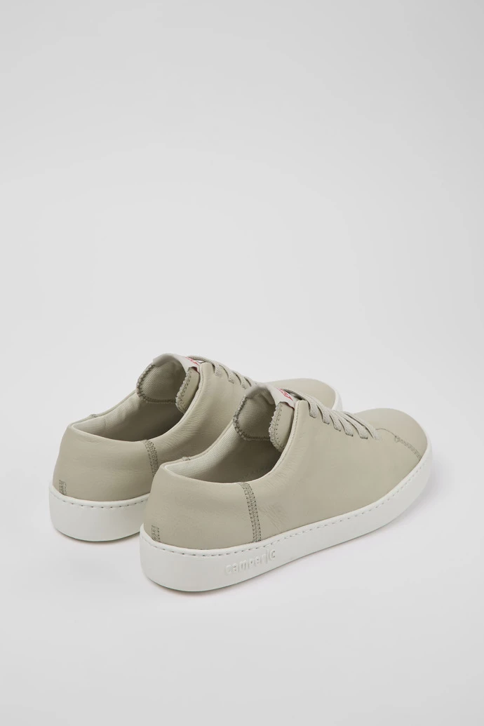 Gray leather men’s sneakers with OrthoLite® Recycled™ footbeds and EVA outsoles (20% recycled).