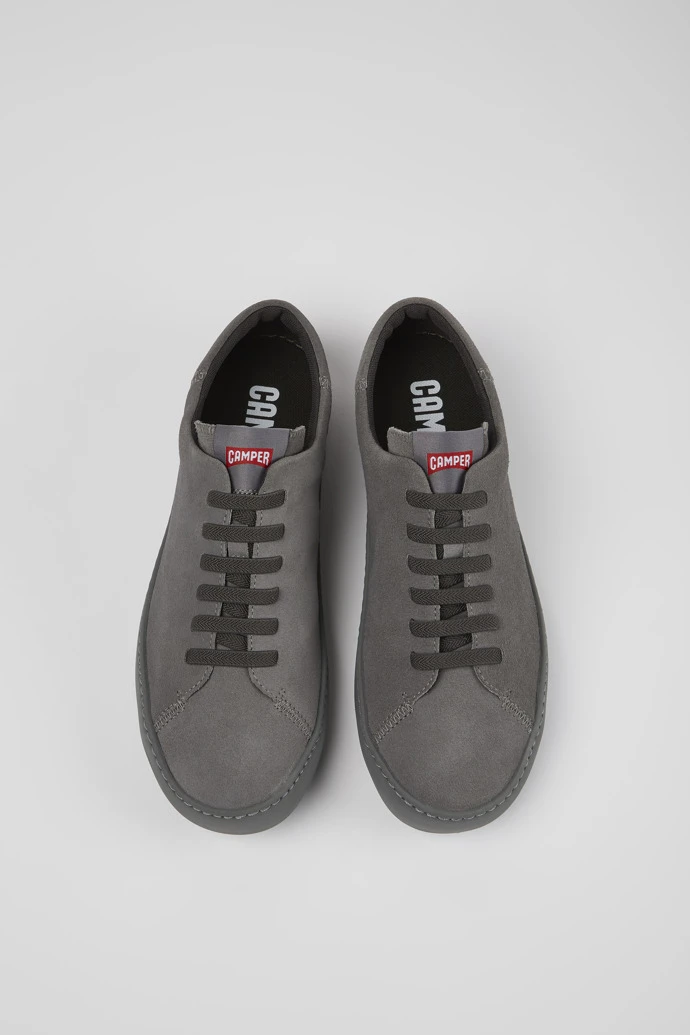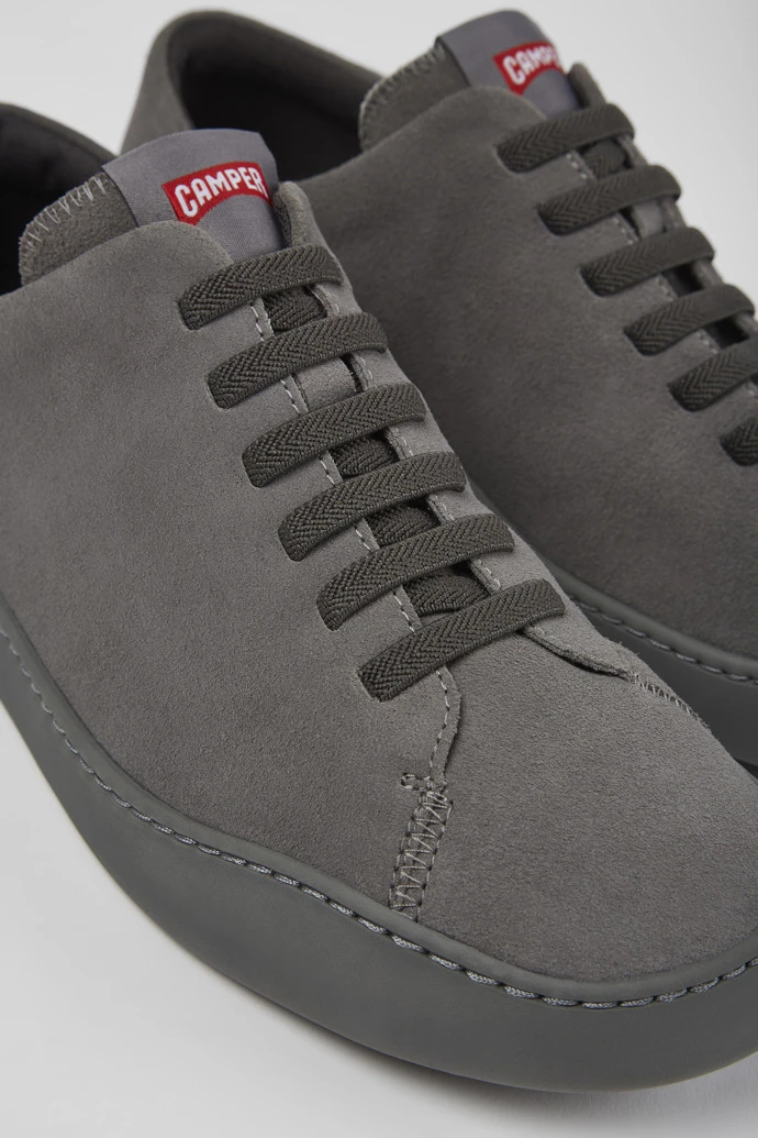 Gray nubuck men’s sneakers with OrthoLite® Recycled™ footbeds and EVA outsoles (20% recycled).
