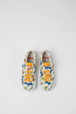 Multicolored textile kids’ shoes with animal motif, elastic laces, and EVA outsoles.