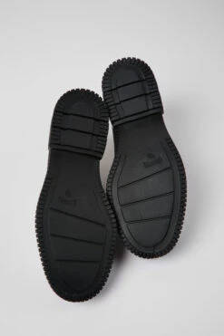 Black and gray leather men’s shoes with OrthoLite® Recycled™ removable footbeds and EVA outsoles.