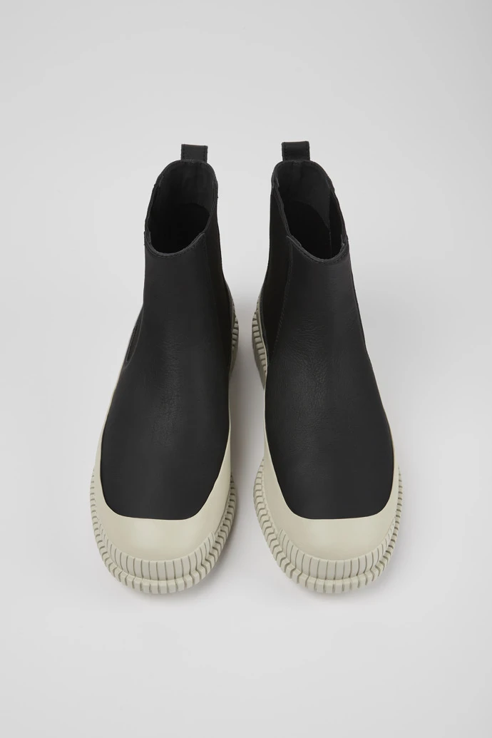 Black leather men’s chelsea boots with OrthoLite® Recycled™ removable footbeds and EVA outsoles.