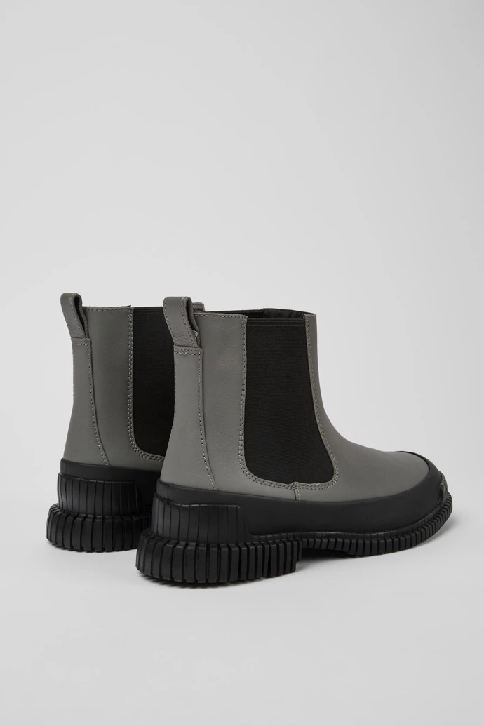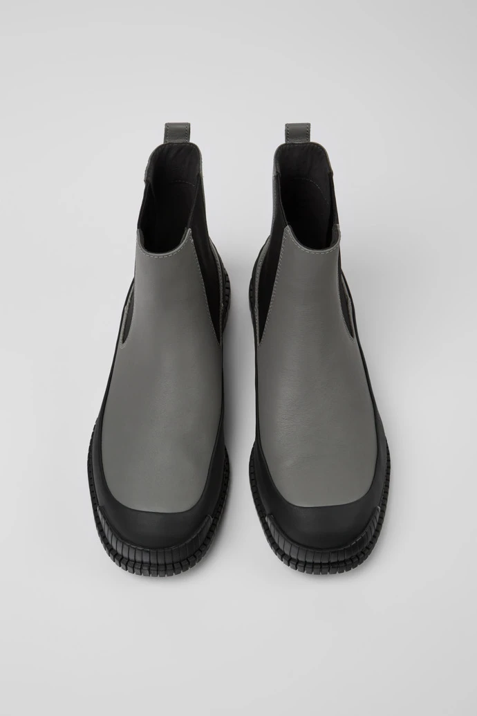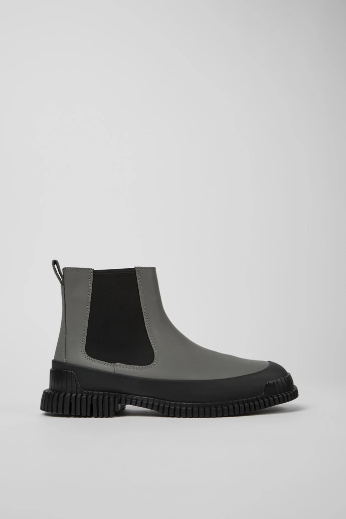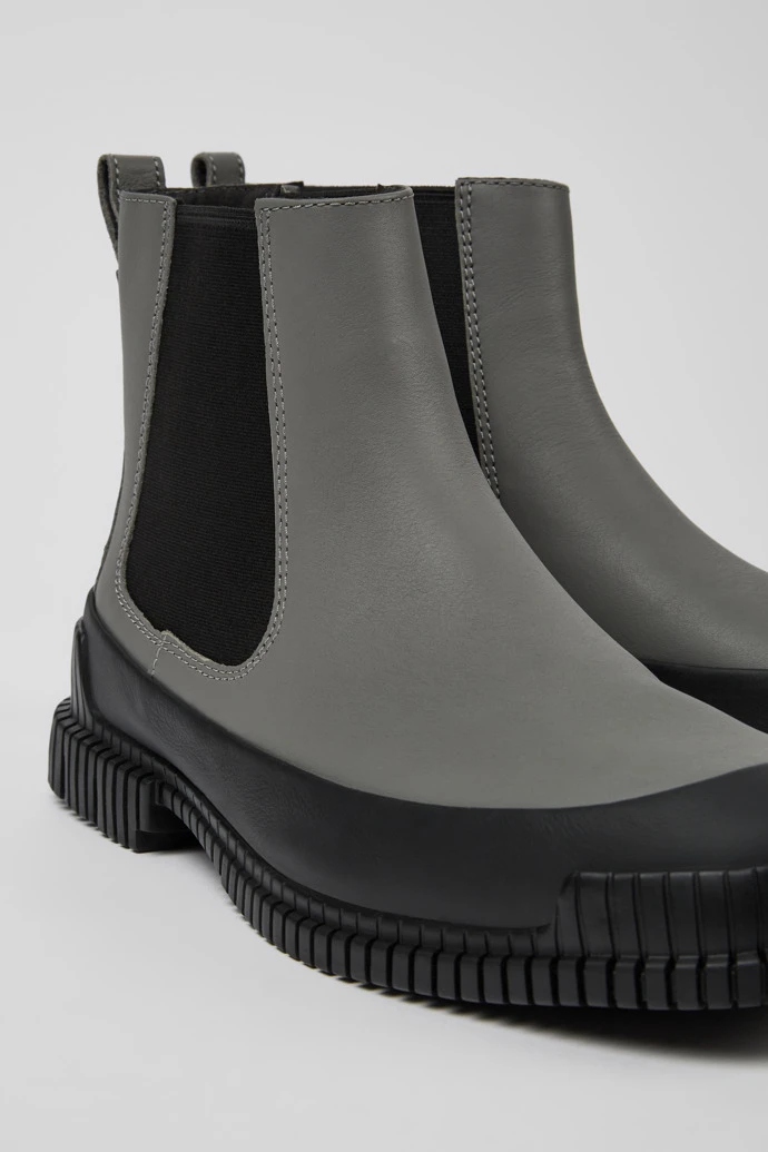 Gray and black leather men’s Chelsea boots with EVA outsoles.