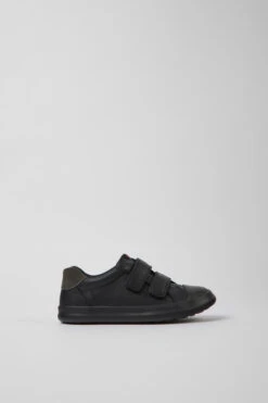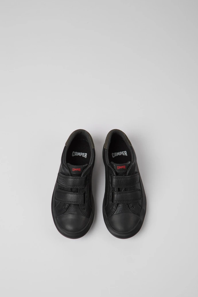 Black leather and nubuck kids’ sneakers with hook-and-loop closing system, OrthoLite® Recycled™ removable footbeds, and rubber outsoles.