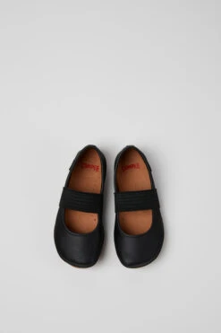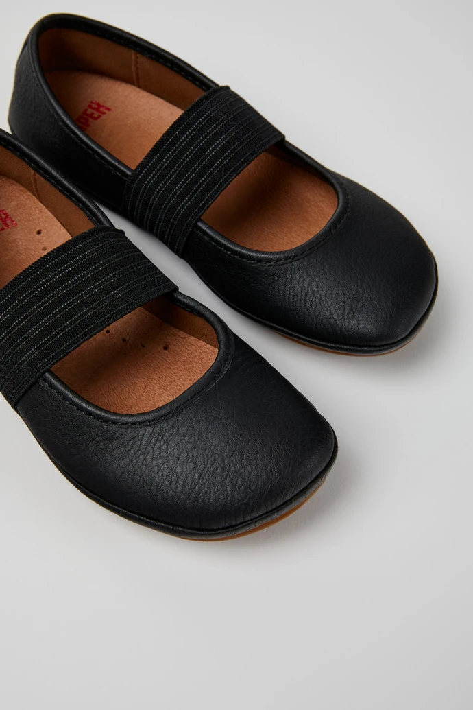 Black leather kid’s ballerinas with elastic band, removable EVA footbed and rubber outsole (20% recycled)