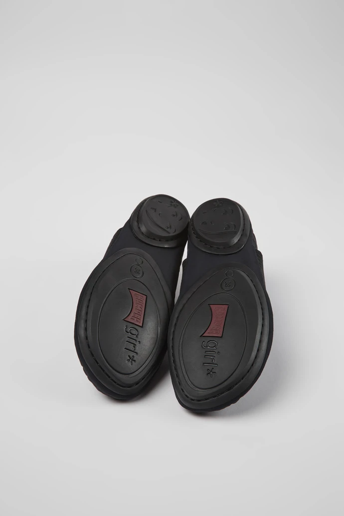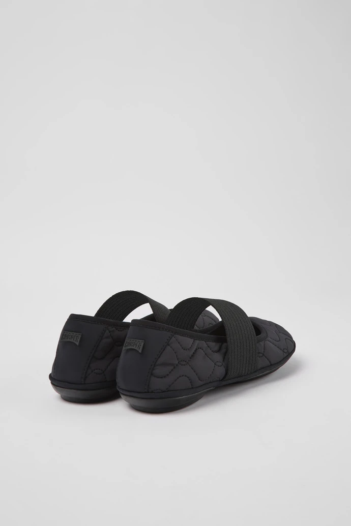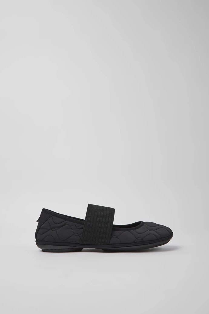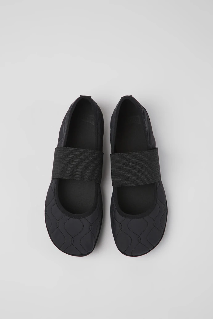 Black recycled PET women’s ballerinas with removable EVA footbeds and rubber outsoles (20% recycled).