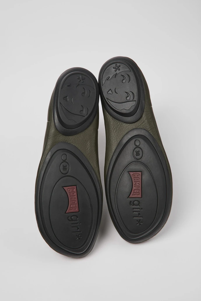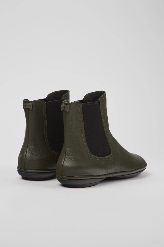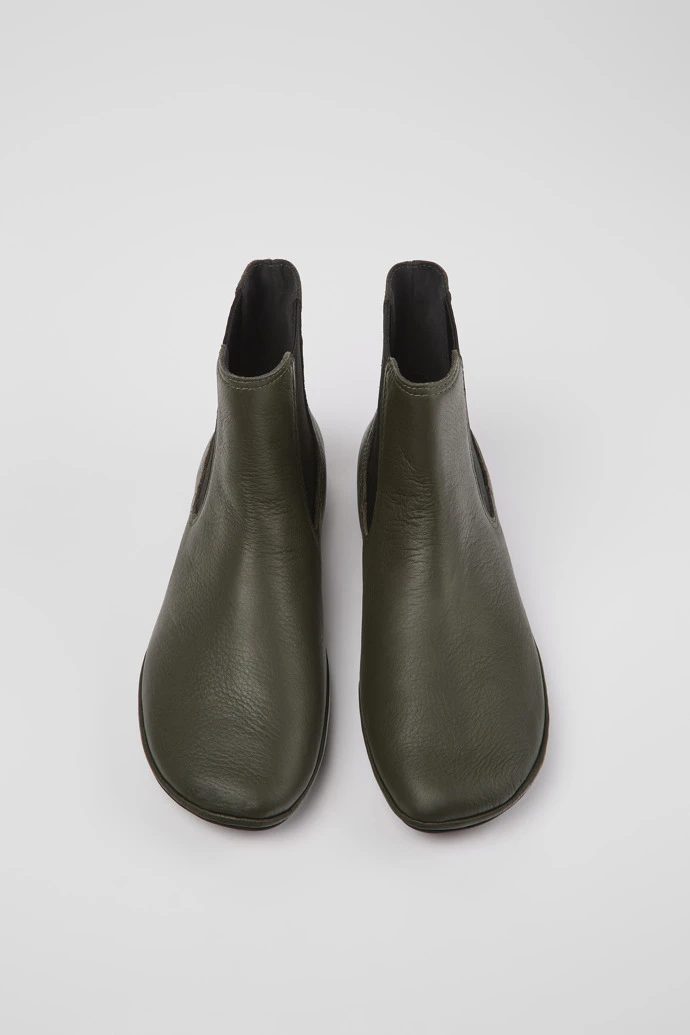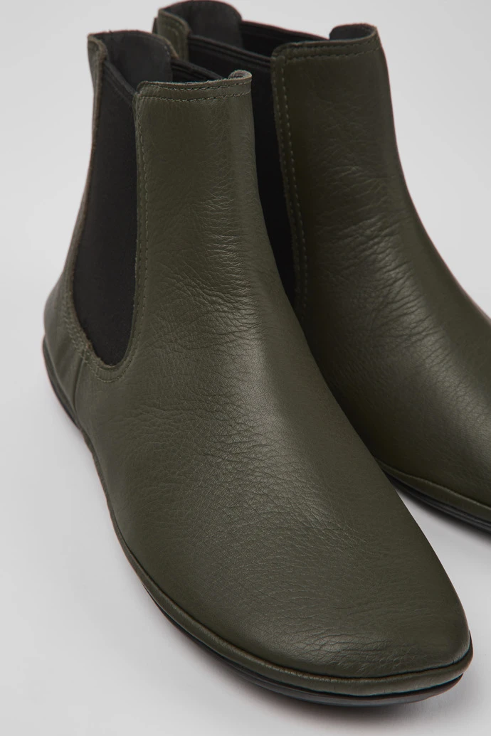 Green leather women’s ankle boots with rubber outsoles (20% recycled).