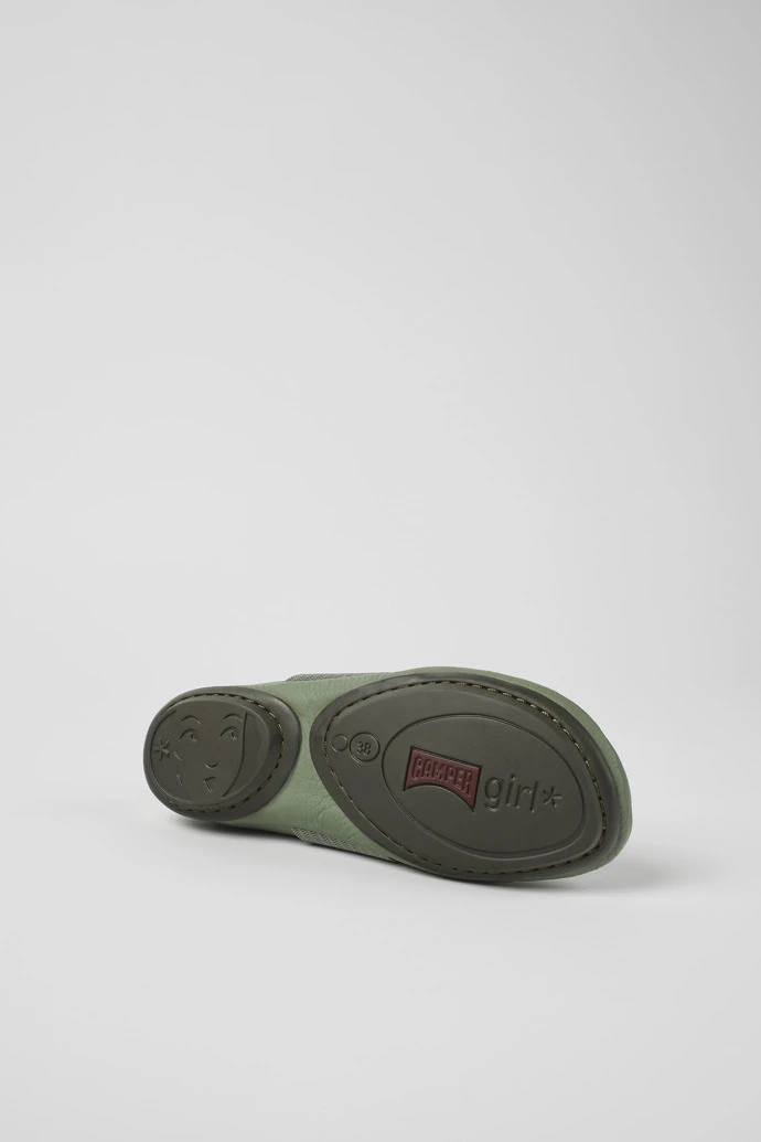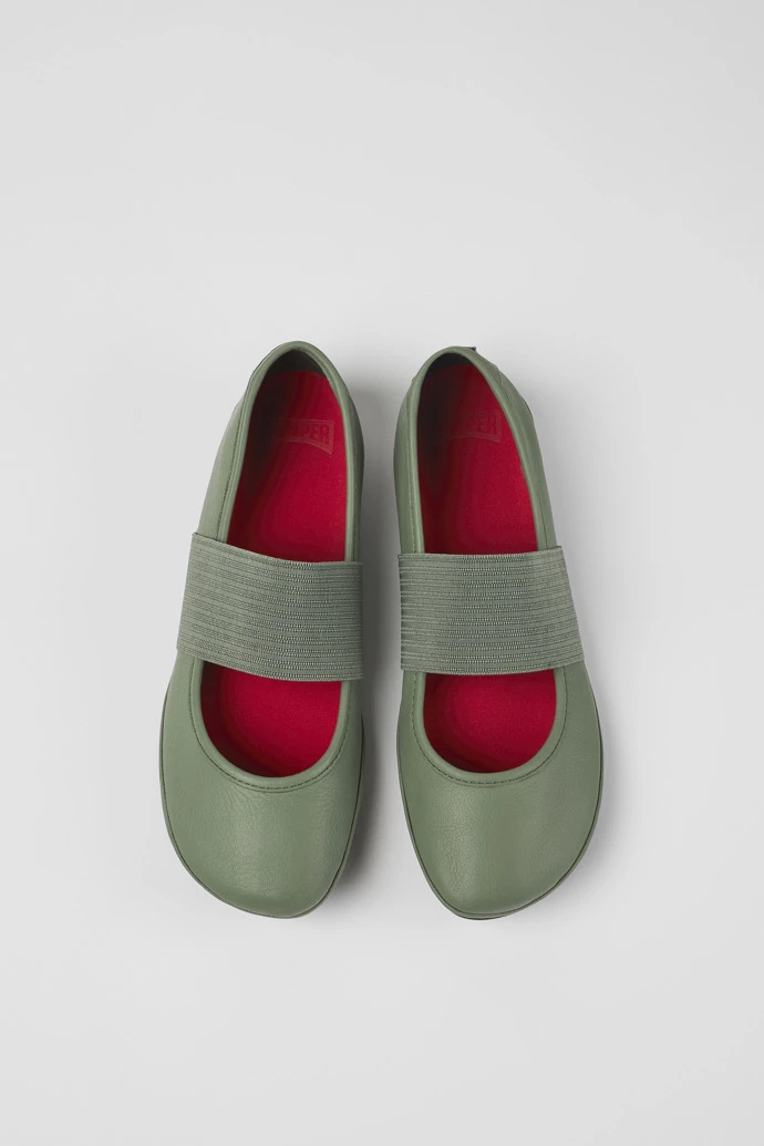 Green leather women’s ballerinas with rubber outsoles (20% recycled).