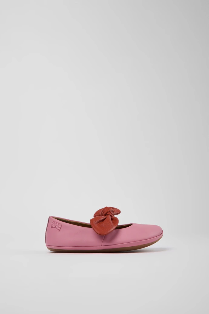 Pink and red leather kid’s ballerinas with elastic bow band, removable EVA footbed and rubber outsole (20% recycled)