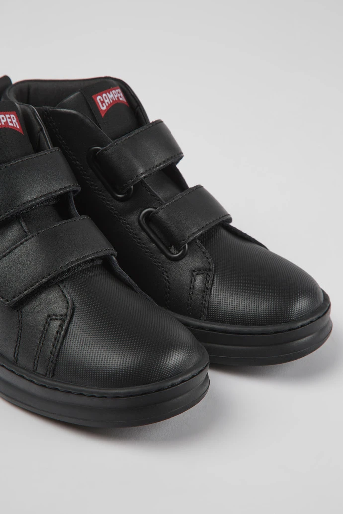 Black leather and textile kids’ ankle boots with OrthoLite® Recycled™ removable footbeds and rubber outsoles.