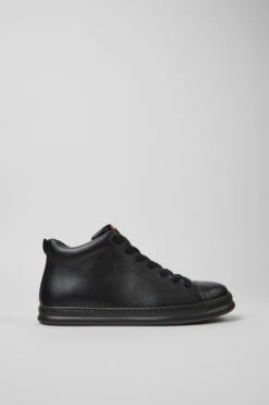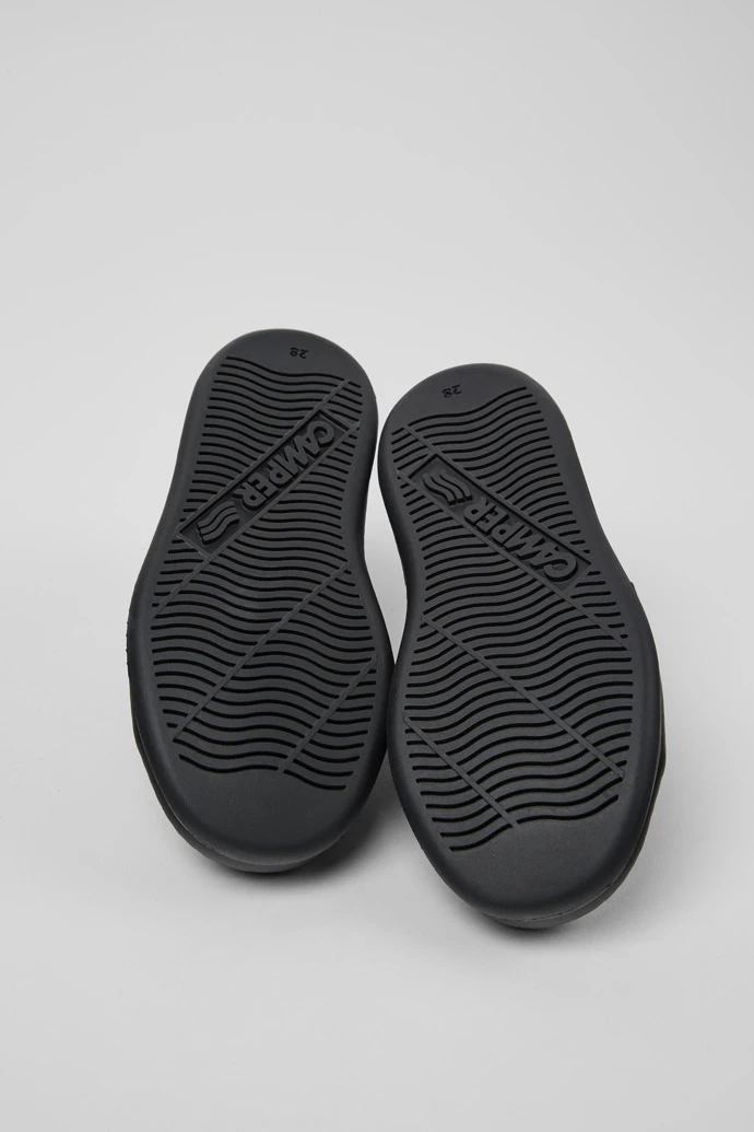 Black leather and textile kids’ sneakers with hook-and-loop closing system, OrthoLite® Recycled™ removable footbeds, and rubber outsoles.