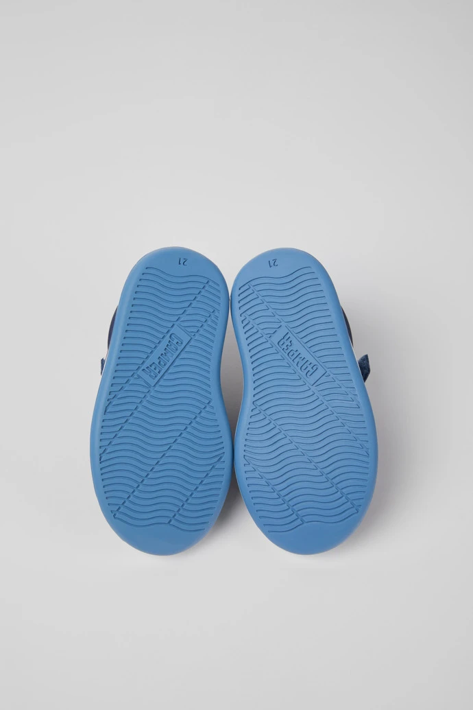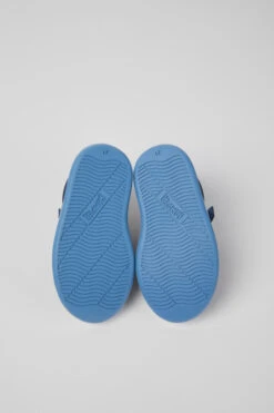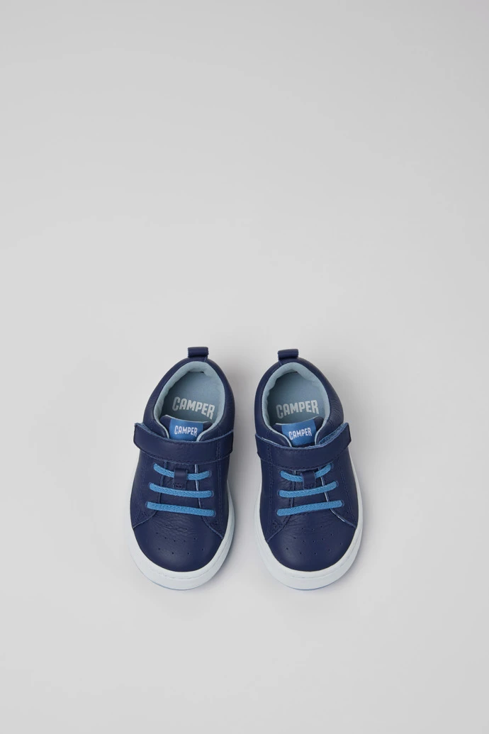 Blue leather kids’ sneakers with a hook-and-loop closing system, OrthoLite® Recycled™ removable footbeds, and rubber outsoles.