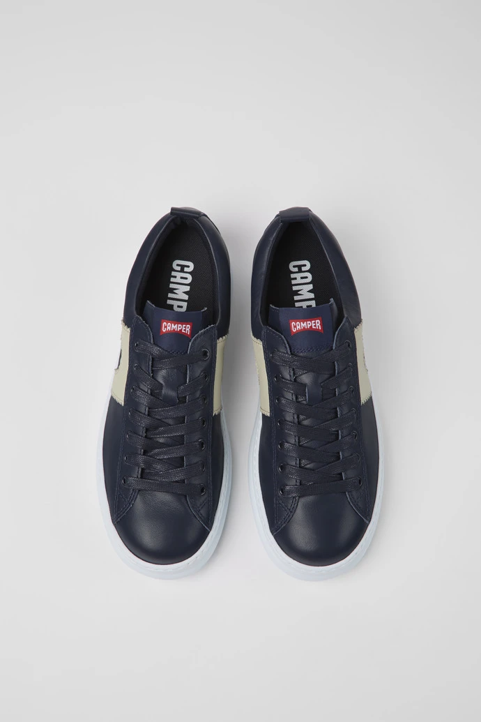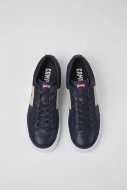 Blue leather men’s sneakers with OrthoLite® Recycled™ removable footbeds and EVA outsoles.