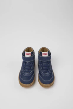 Dark blue recycled leather and nubuck kids’ ankle boots with hook-and-loop closing system, OrthoLite® Recycled™ removable footbeds, and rubber outsoles (20% recycled).
