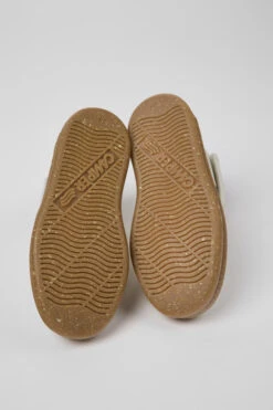White recycled leather and nubuck kids’ ankle boots with hook-and-loop closing system, OrthoLite® Recycled™ removable footbeds, and rubber outsoles (20% recycled).