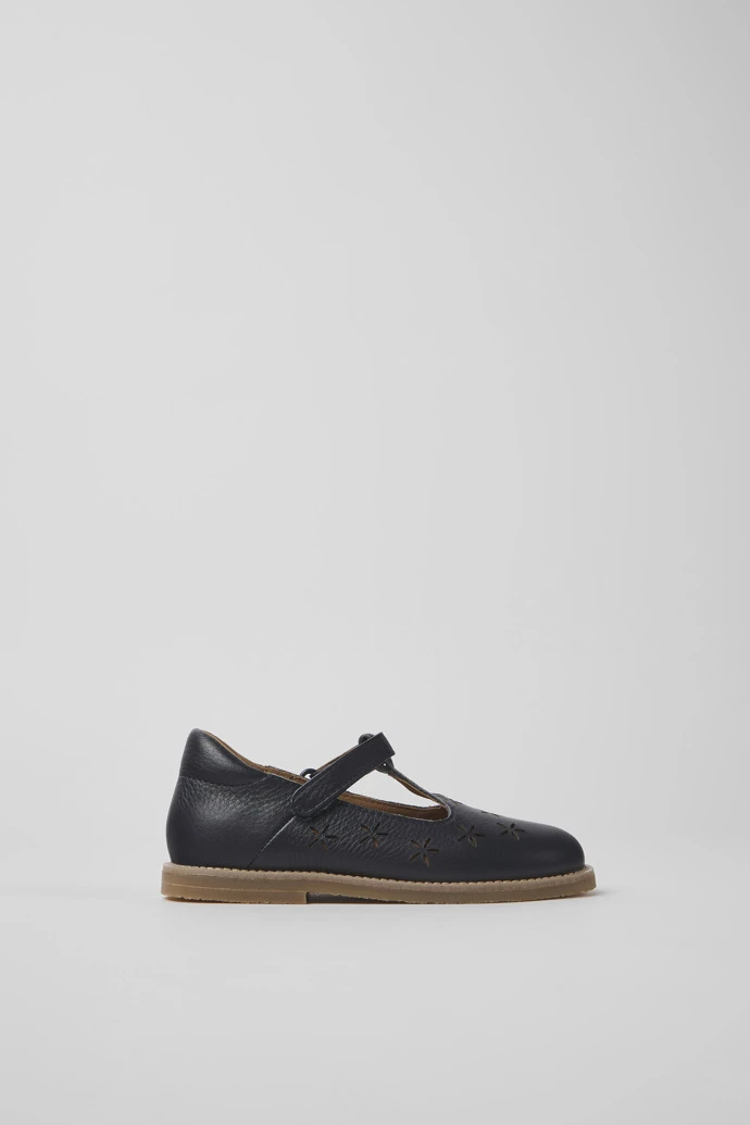 Navy blue leather kids’ shoes with OrthoLite® Recycled™ removable footbeds and rubber outsoles.