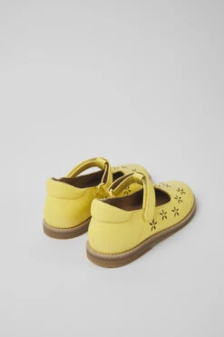 Yellow leather kids’ shoes with OrthoLite® Recycled™ removable footbeds and rubber outsoles.