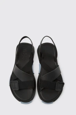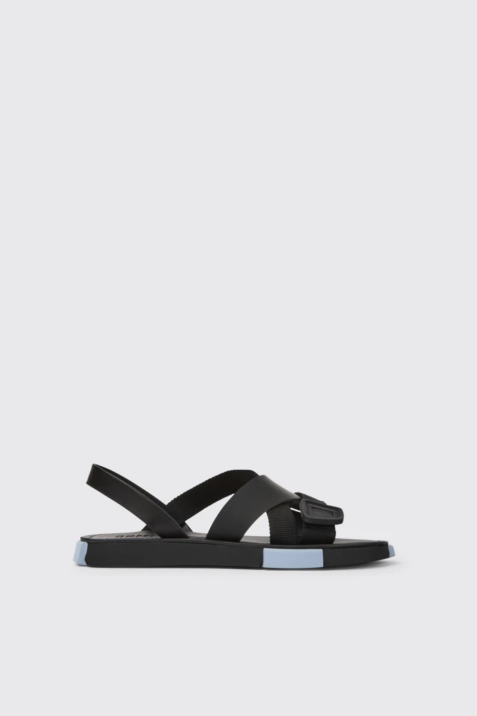 Black leather and recycled PET webbing men’s sandals with EVA and rubber outsoles (20% recycled) and hook-and-loop closing system.