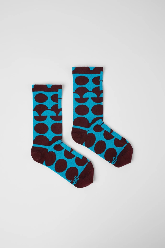 Burgundy and blue unisex socks made with 68% organic cotton.