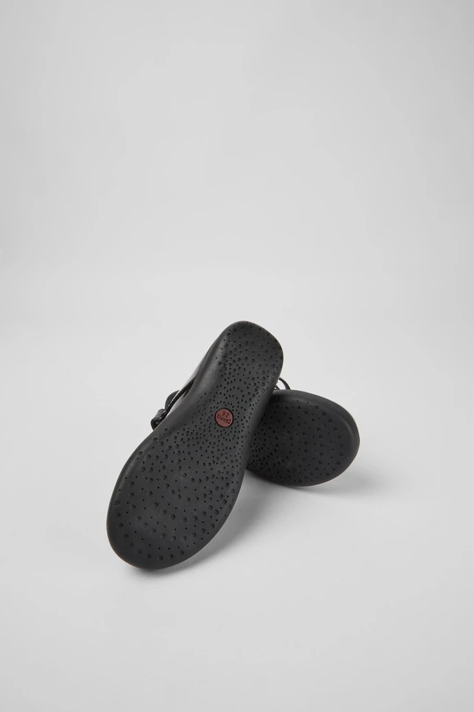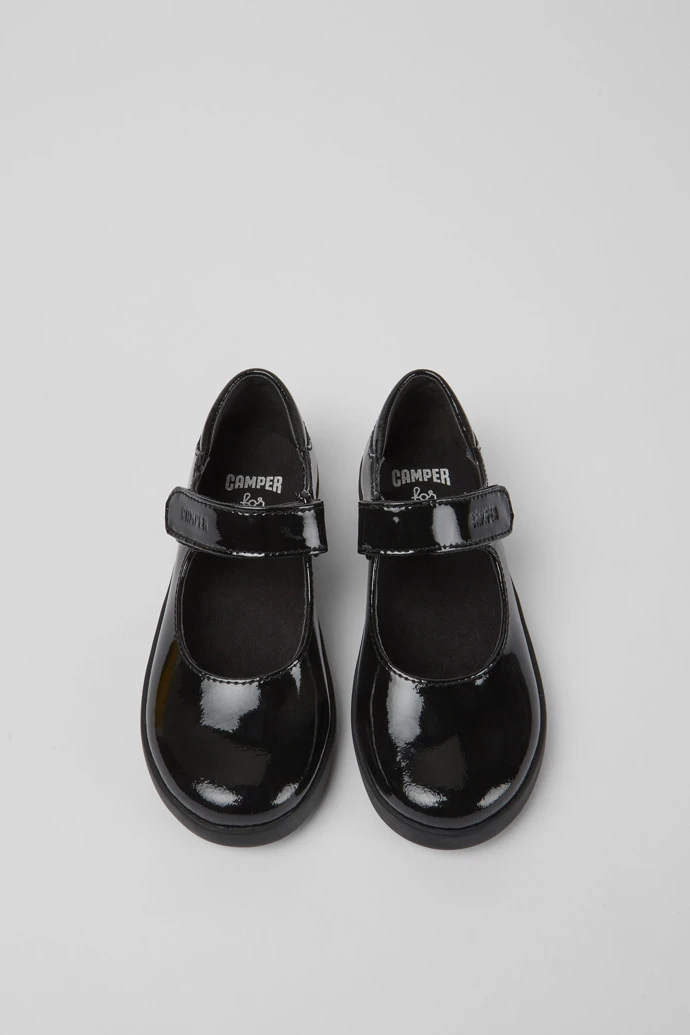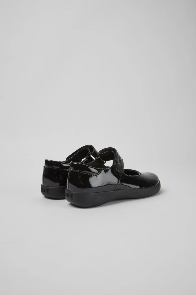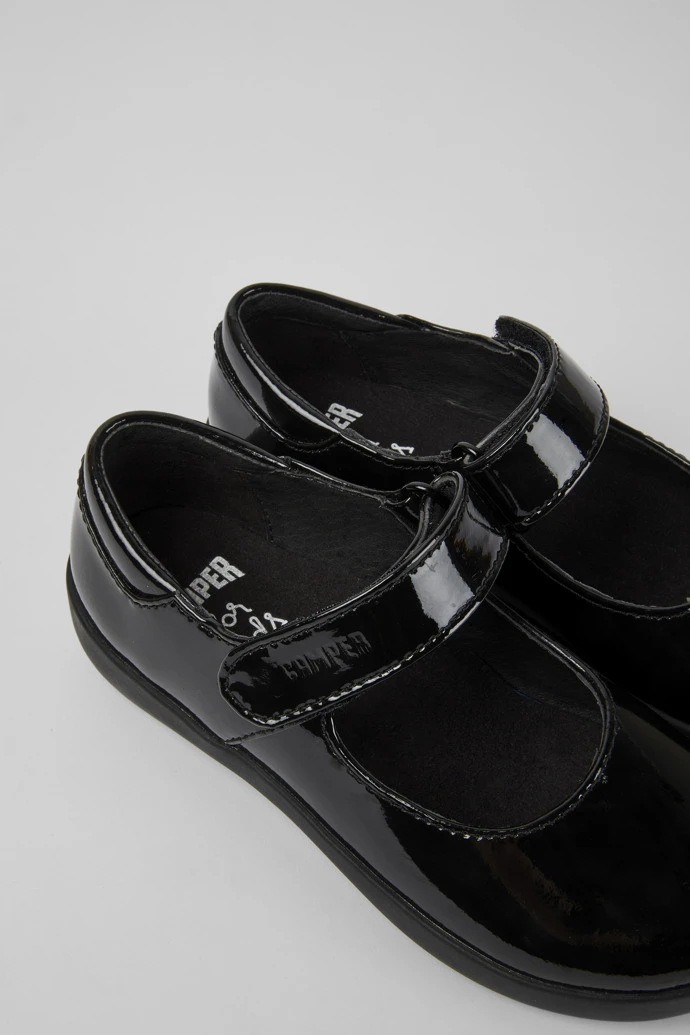 Girls’ black patent leather ballerina shoes with rubber outsole.