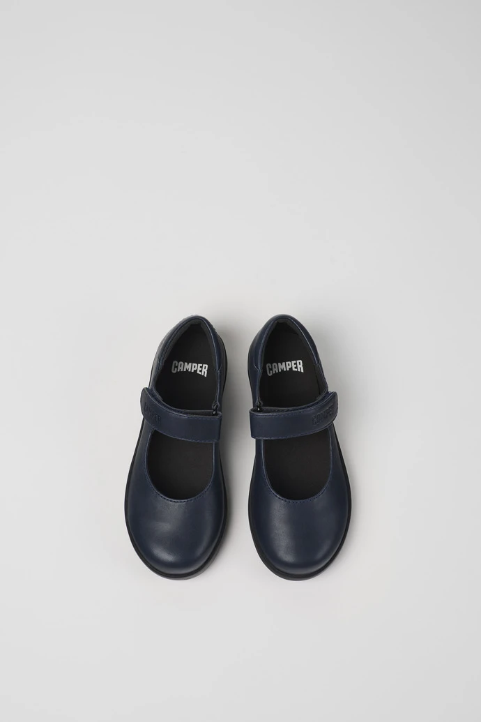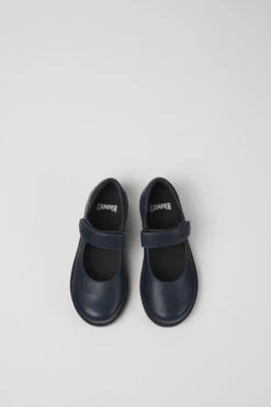 Navy blue leather kids’ Mary Jane shoes with OrthoLite® Recycled™ removable footbeds and rubber outsoles.