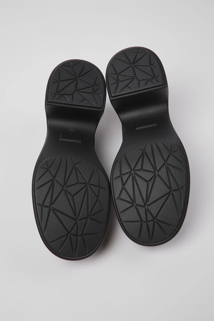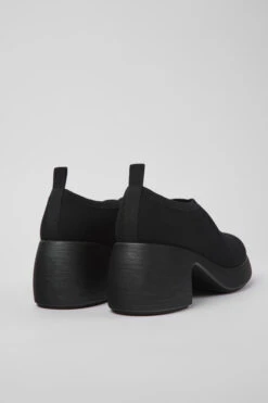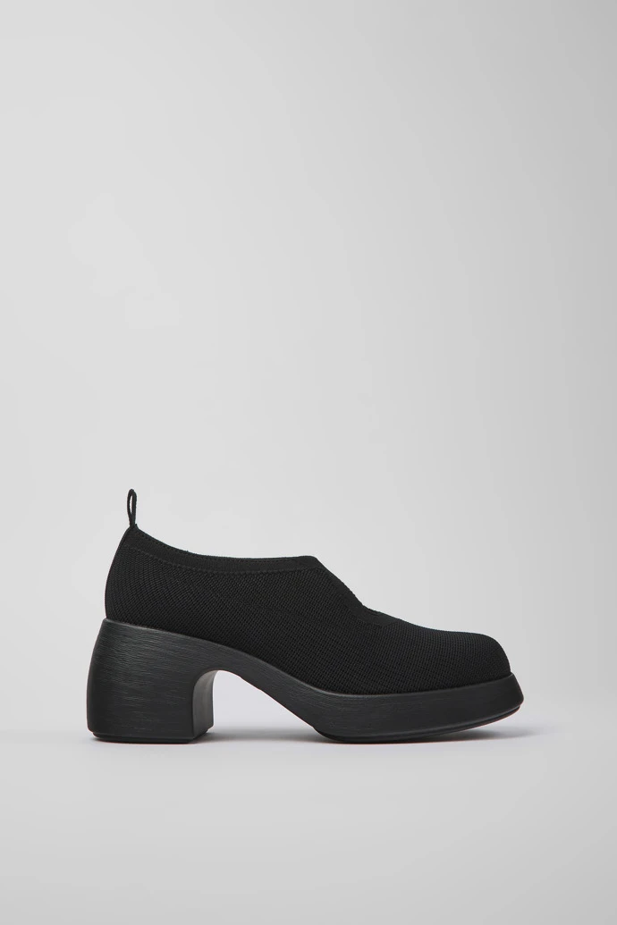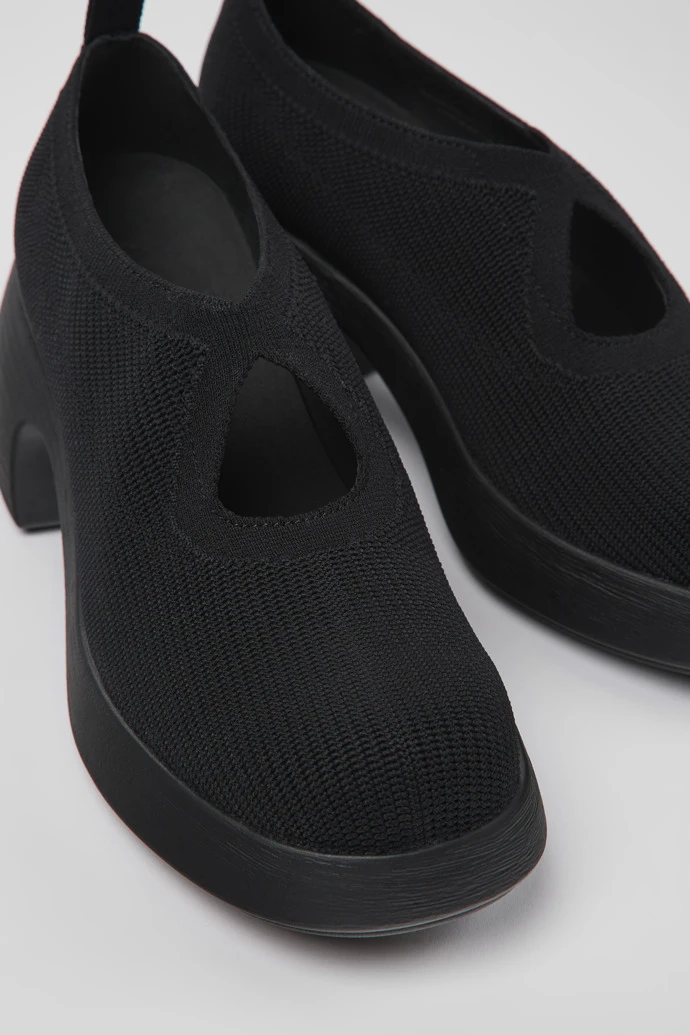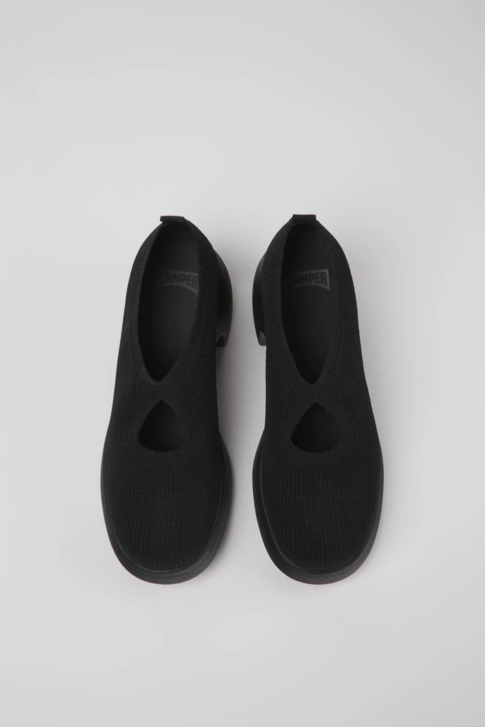 Black recycled PET one-piece knit women’s shoes with removable EVA footbeds and PU outsoles.