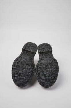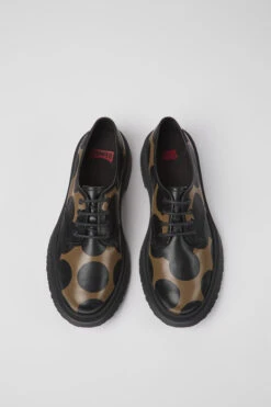 Black and brown leather men’s shoes with a graphic circular motif, OrthoLite® Recycled™ removable footbeds, and rubber outsoles.