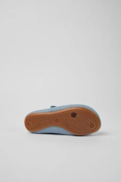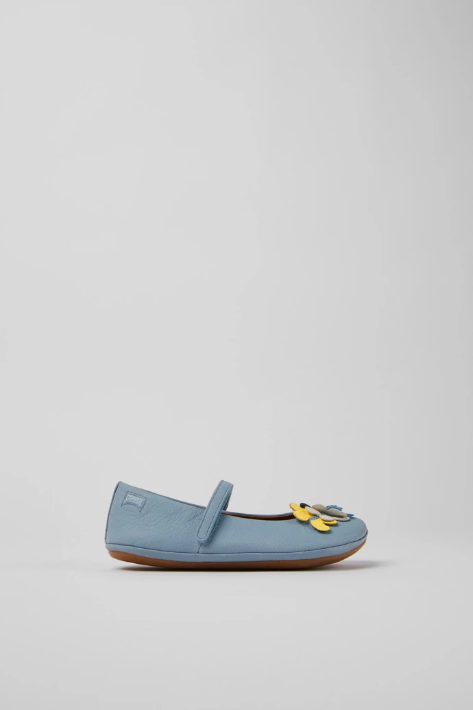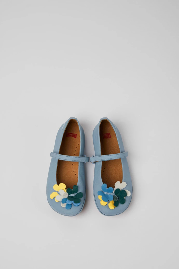 Blue leather kids’ ballerinas with flower detail, removable EVA footbeds, and rubber outsoles (20% recycled).