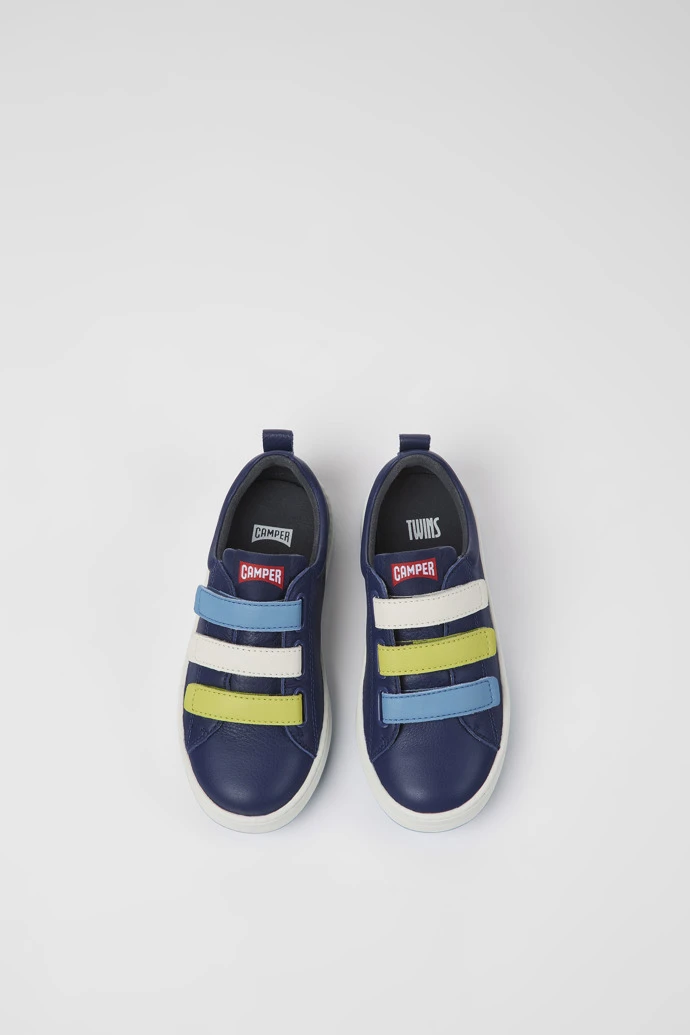 Blue leather kids’ sneakers with OrthoLite® Recycled™ removable footbeds and rubber outsoles.