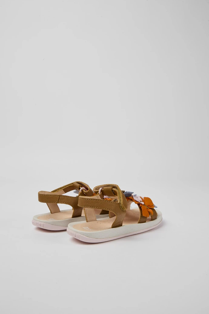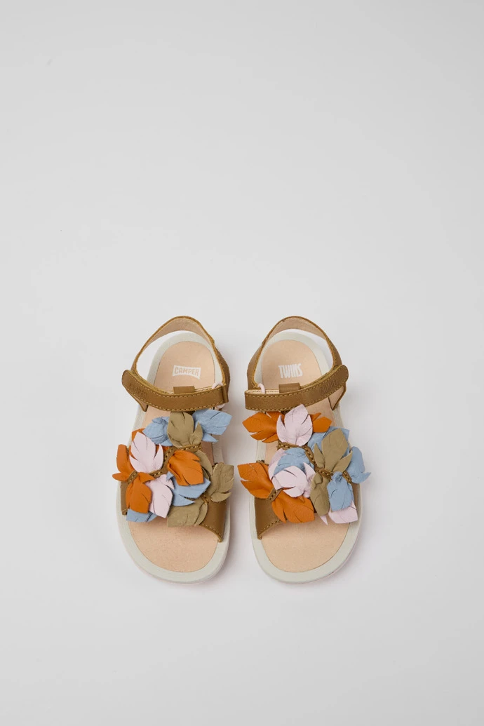 Brown leather girls’ sandals with multicolored details, hook-and-loop closing system, and 100% rubber outsoles (20% recycled).