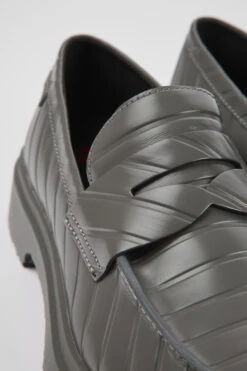 Gray leather men’s loafers with OrthoLite® Recycled™ removable footbeds and rubber outsoles.