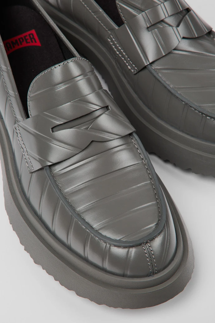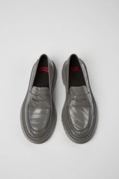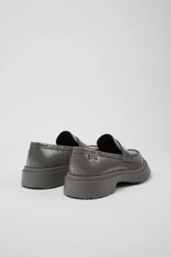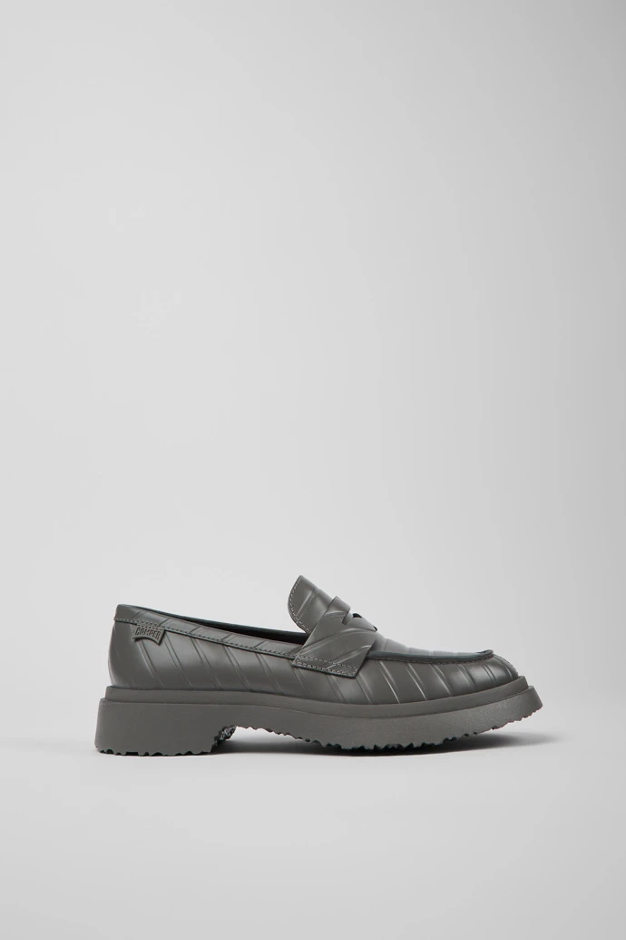 Gray leather women’s loafers with OrthoLite® Recycled™ removable footbeds and rubber outsoles.