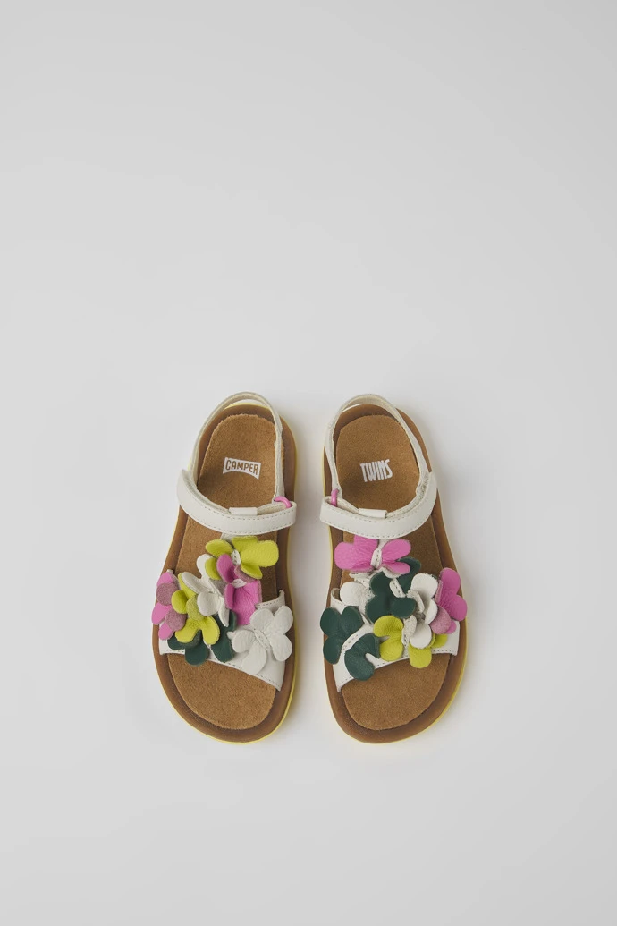 Multicolored leather kids’ sandals with a hook-and-loop closing system and rubber outsoles (20% recycled).