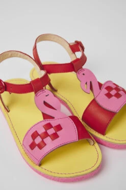 Red and pink leather kids’ sandals with a hook-and-loop closing system and rubber outsoles.