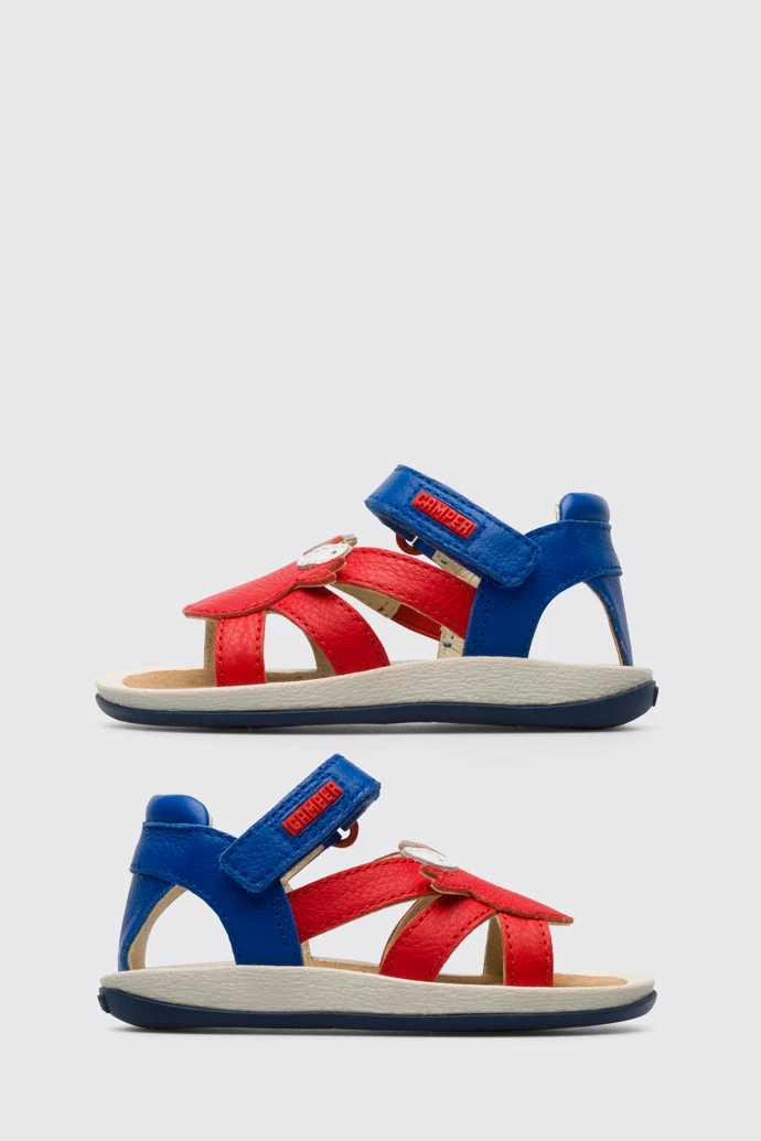 Red TWINS sandal with velcro for kids. Crab-shaped leather upper. 100% brown and blue rubber outsole.