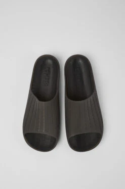Black monomaterial slip-on men’s sandals with 100% TPU outsoles (20% recycled) and removable PU footbed. Fully recyclable.