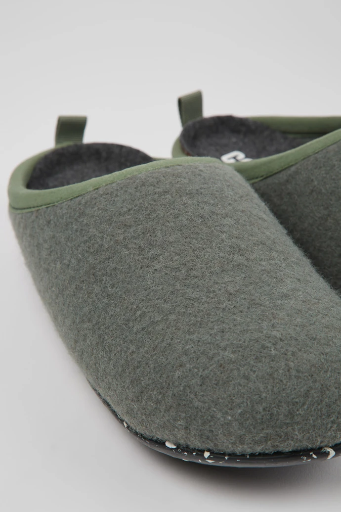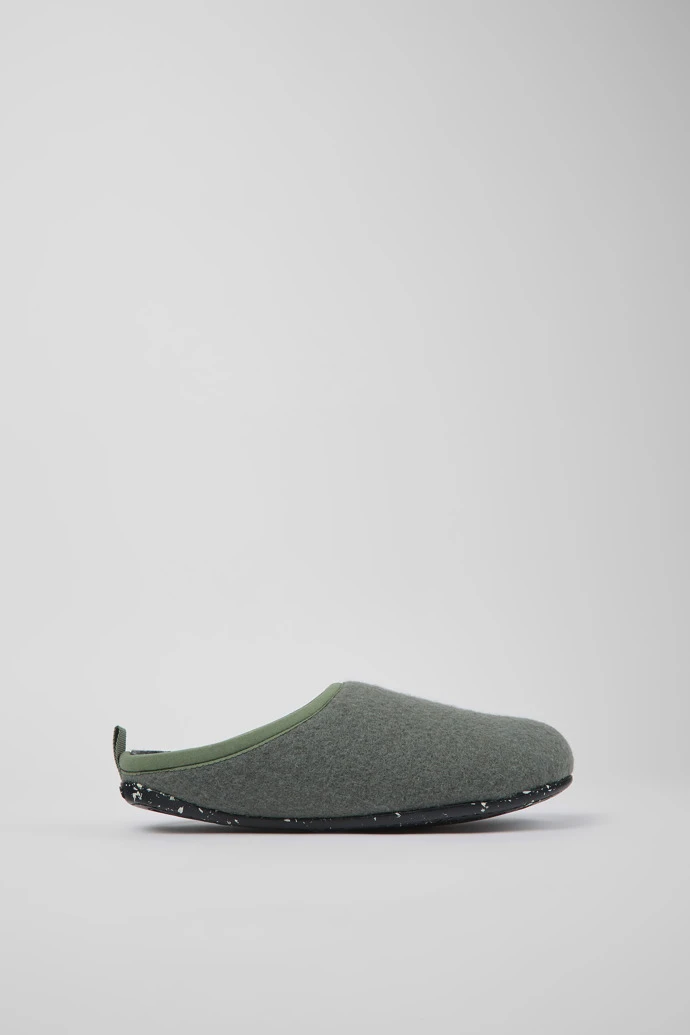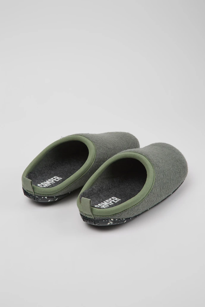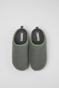 Green wool women’s slippers with EVA footbeds and rubber outsoles.