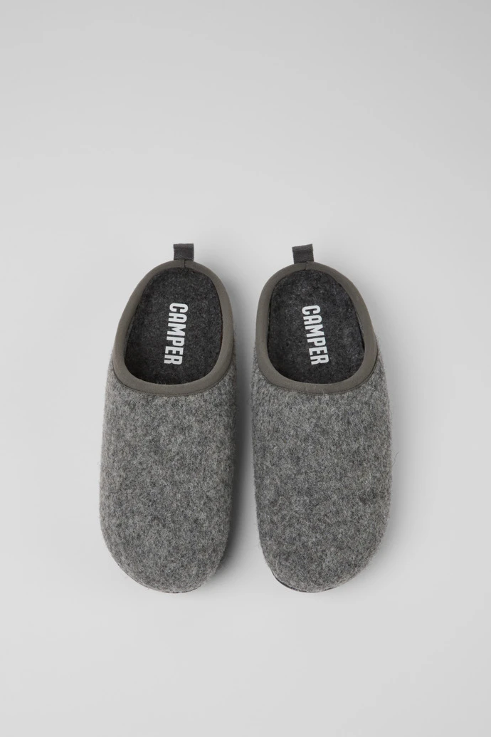Dark gray wool women’s slipper. Rubber outsole and removable EVA insole.