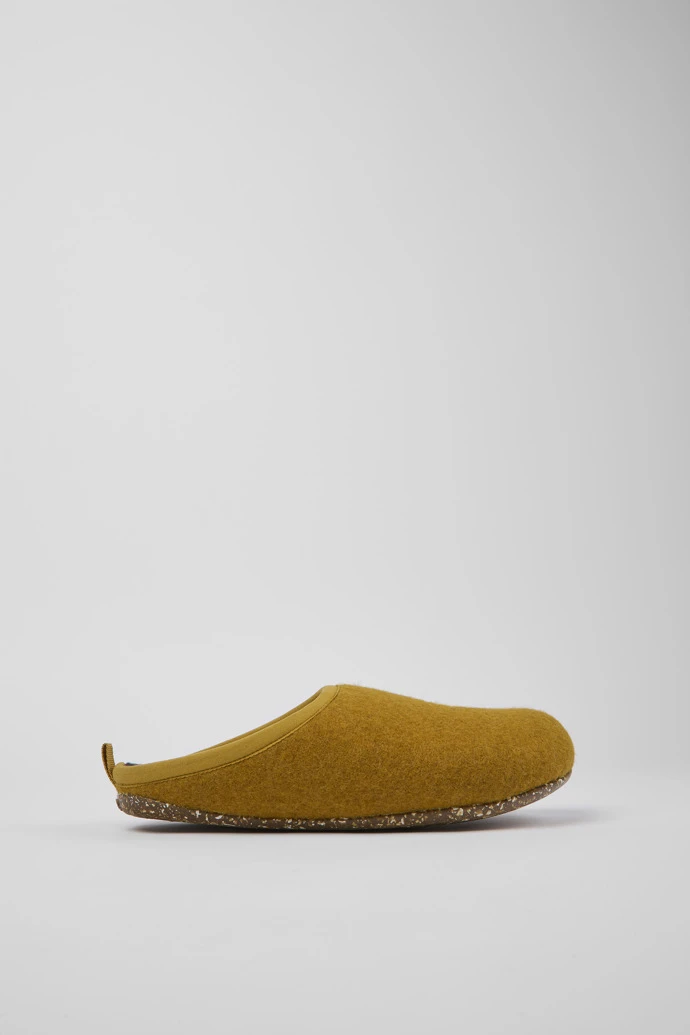 Yellow-brown wool women’s slippers with EVA footbeds and rubber outsoles.